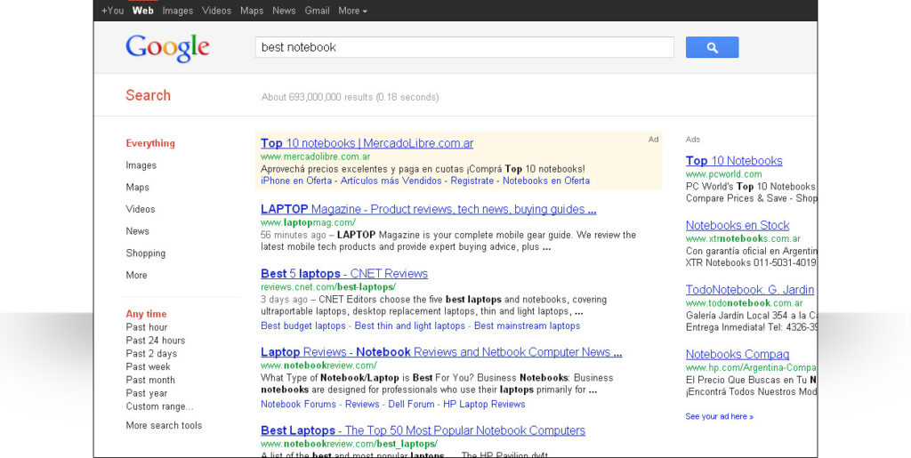 Lo mismo sucede en Google.com.ar cuando un argentino busca por la «mejor notebook»: