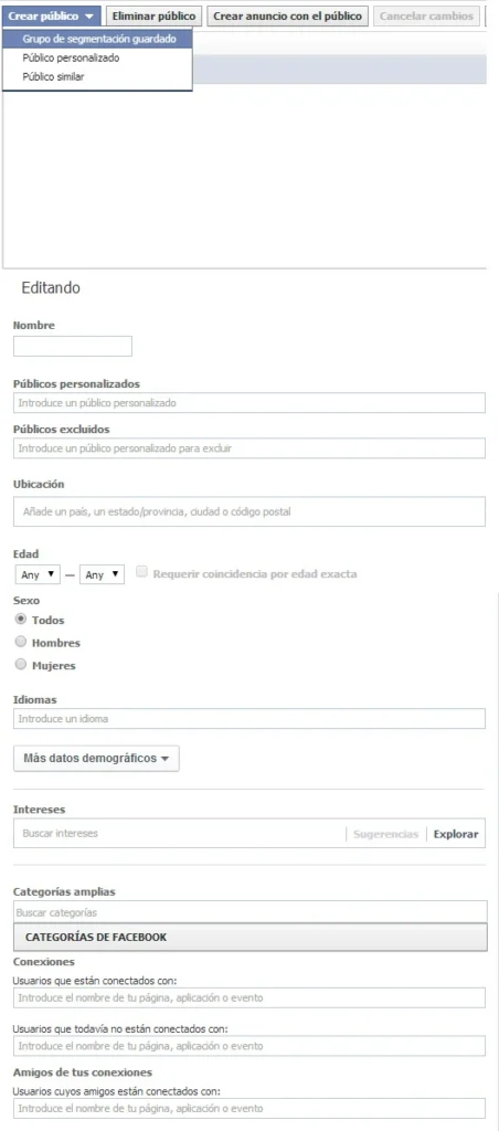 Esta opción, te servirá en el caso que realices distintas campañas apuntadas a un mismo público objetivo, de modo que lleven la misma segmentación. Básicamente, te permitirá configurar manualmente la segmentación y guardar la misma, de modo que puedas utilizarla cuando quieras y no tengas que configurar la segmentación de campaña por campaña.