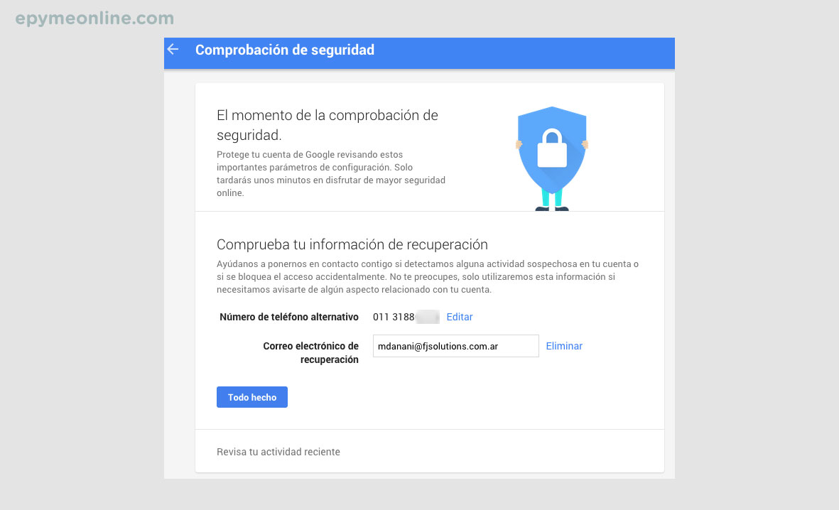 El siguiente paso será verificar que la actividad reciente de tu cuenta esté bien y hacer clic nuevamente en el botón “Todo correcto”.