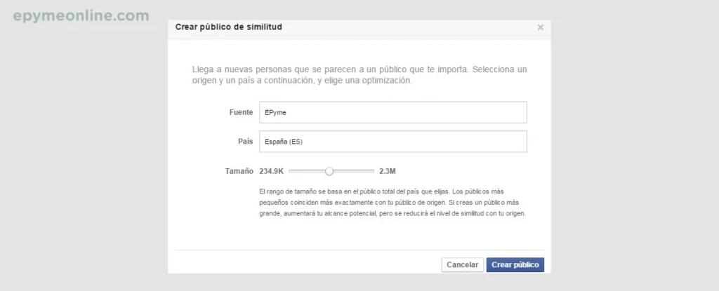 El rango de tamaño se basa en el público total del país que elijas. Los públicos más pequeños coinciden más exactamente con tu público de origen. De modo que si creas un público más grande, aumentará tu alcance potencial, pero se reducirá el nivel de similitud con tu origen.